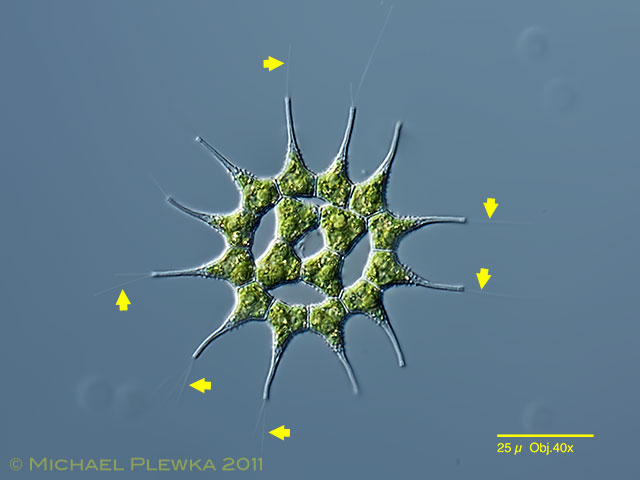 | Pediastrum simplex showing plasmatic processes at the tips of the cells (arrows) |