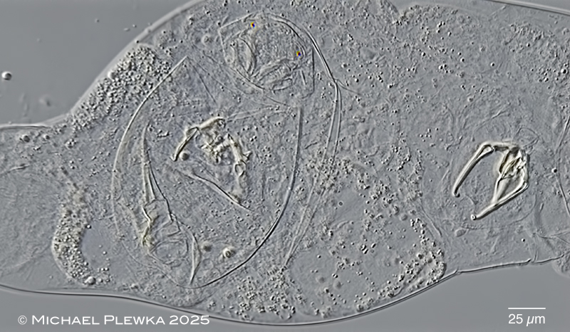 | Aspelta circinator, upper image: another specimen with an engulfed Lepadella- rotifer. Lower image: same specimen, compressed; lorica of Lepadella (also visible are the foot with toes and the malleate trophi) on the left side and the forcipate trophi of Aspelta on the right (6) |
