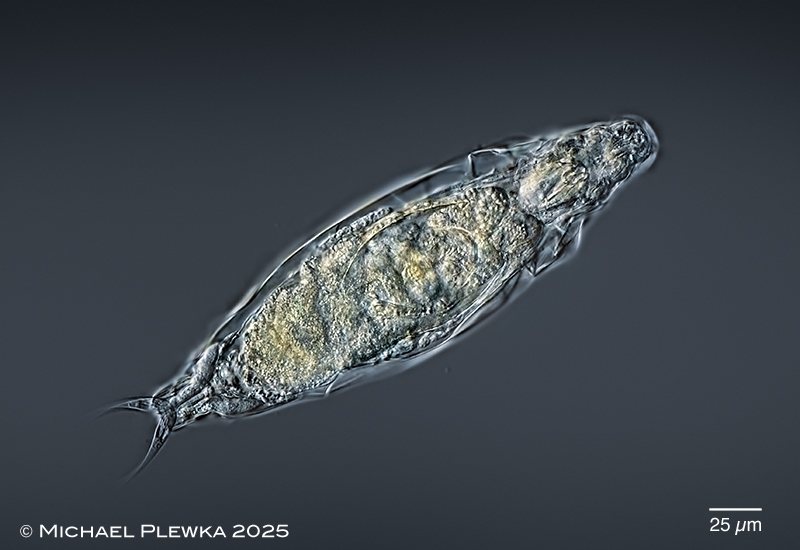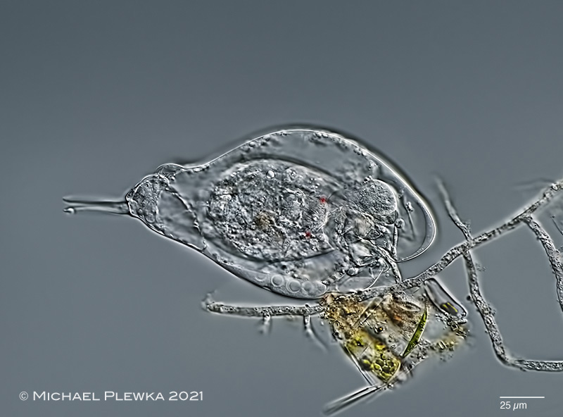 | Aspelta circinator, the same specimen has engulfed a Lepadella rotifer, a species which is caught by Zoophagus insidians very often. Head of Aspelta retracted. So it is posiible that this Aspelta-specimen has either caught the Lepadella specimen that had been caught by Zoophagus first, or Aspelta swallowed the Lepadella specimen first and then swallowed the fungus afterwards. (4) |