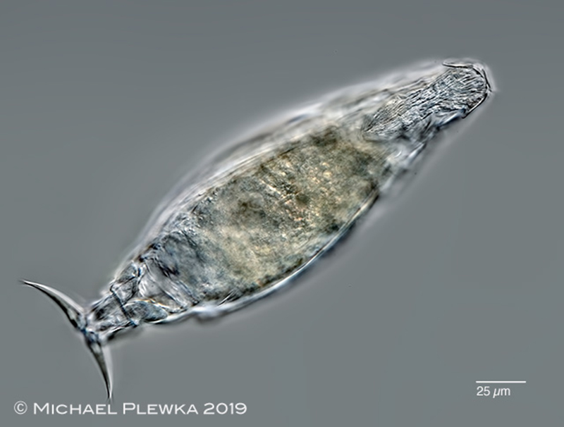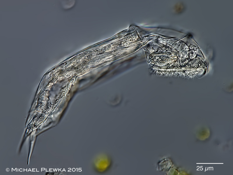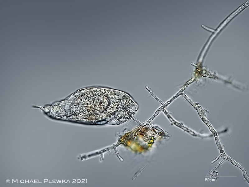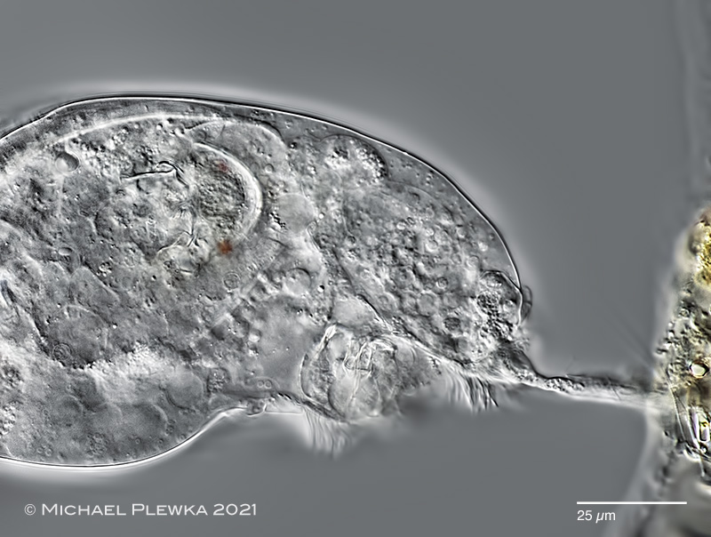 | Aspelta circinator, specimen from (4); in contact with the rotiferophagous fungus Zoophagus sp.. The head/ corona of Aspelta is retracted (see images below). Reaction to the contact with the fungus??? |