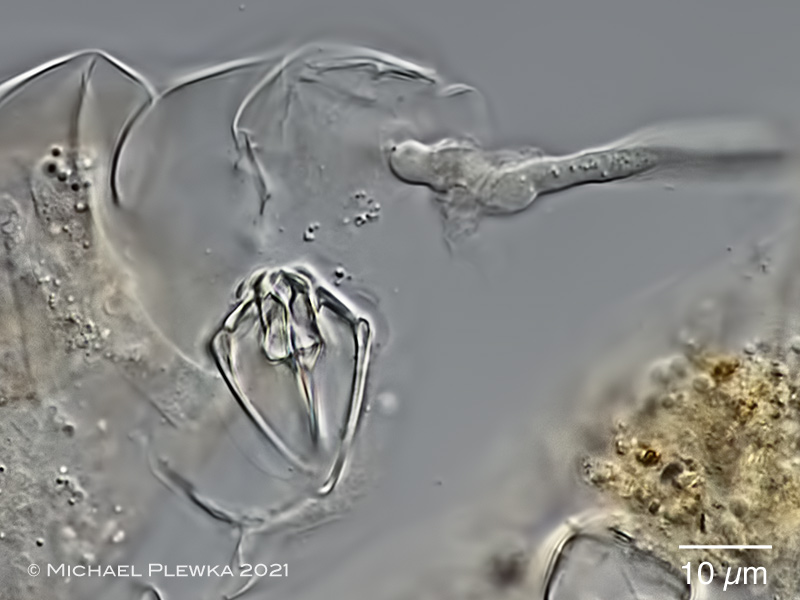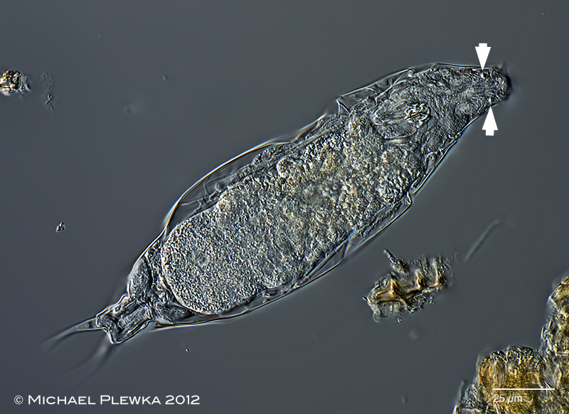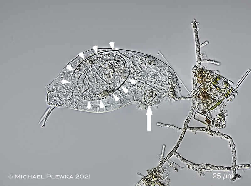 | Aspelta circinator, same specimen, compressed by coverslide. From this image the question arises: how can these relative small forcipate trophi (arrow) of Aspelta manage to engulf this relative big Lepadella-prey (shape marked by arrowheads)?. (4) |