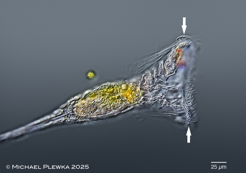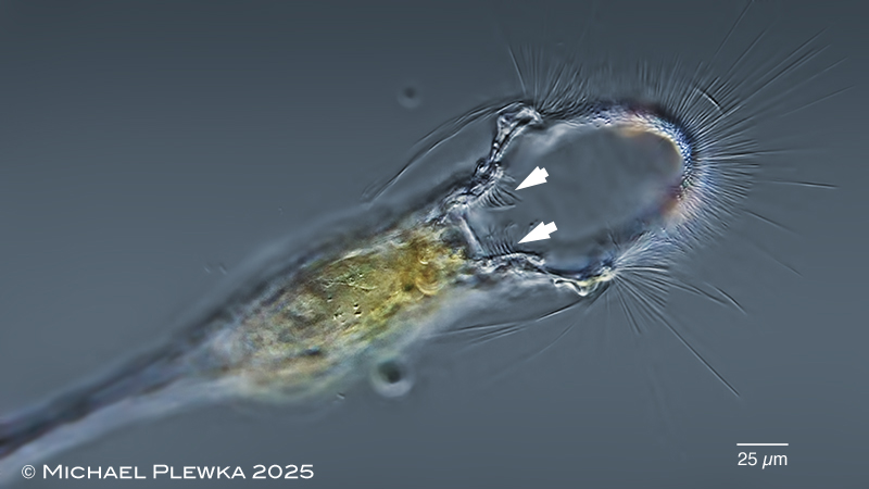 Collotheca mutabilis; the arrows point to some of the motile cilia of this specimen (in lateral view) in the phase of the recovery stroke so they are bowed backwards. This means their effective stroke is to the front. This results in backwards swimming, like in some Conochilus species. (4)