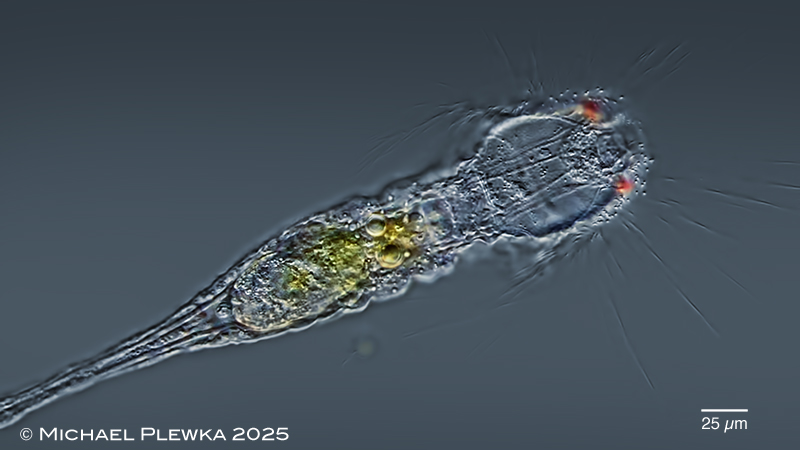 Collotheca mutabilis; this pelacic rotifer has two red eyespots on the dorsal lobe of the corona even in the adult stage (in contrast to other Collotheca species where the eyespots are reduced in the adult stage). C. mutabilis is one of the plankton species which swims backwards. (2)