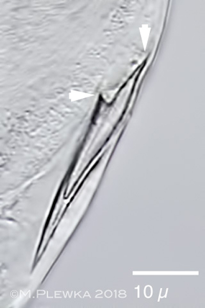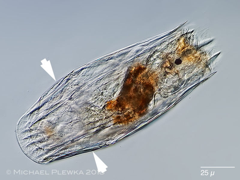 | Notholca bipalium, two crops of the above image. The arrowheads point to the suspensions of the appendages, which may be homologous to the appendages of Filinia longiseta. |