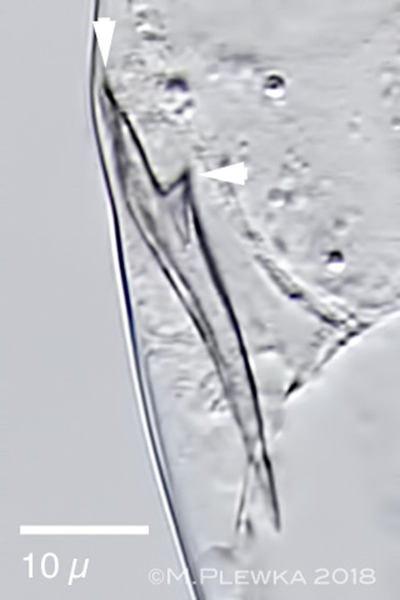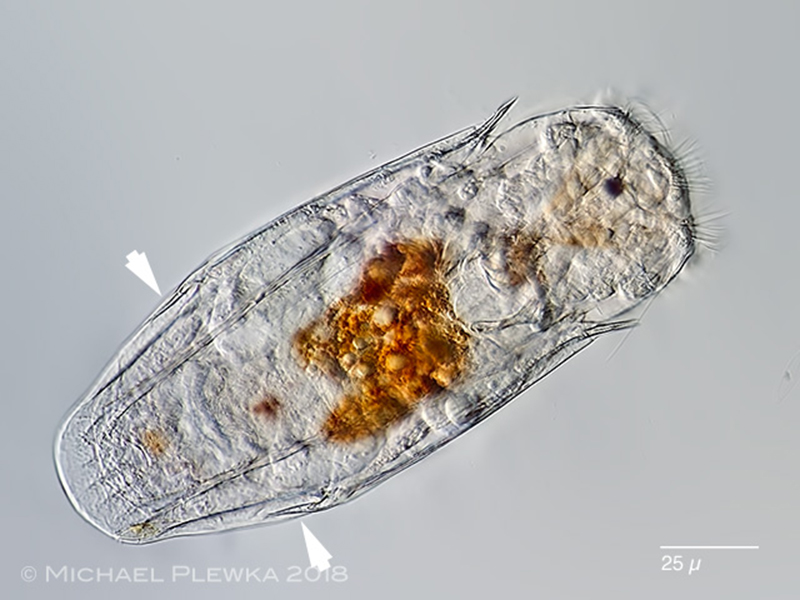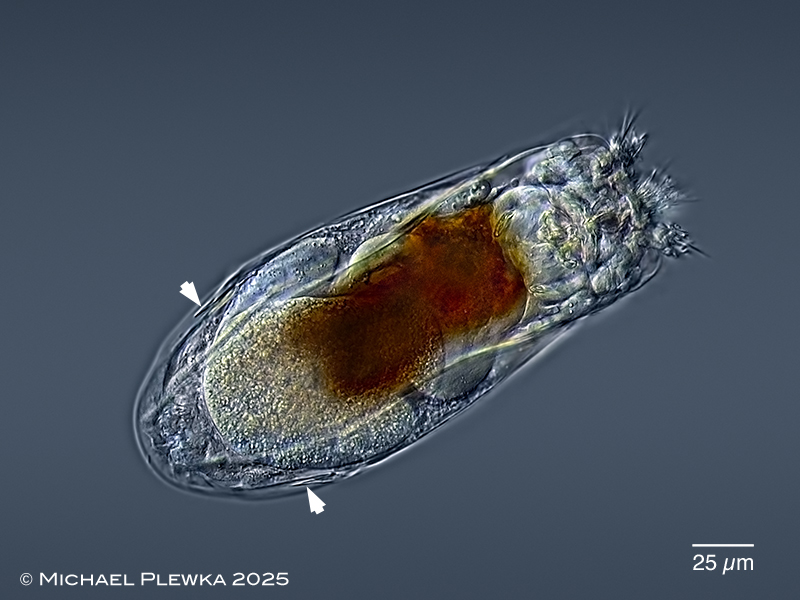 | Notholca bipalium, a halophile rotifer, swimming, (dorso-) ventral view; typical traits are the very unconspicuous lateral appendages (arrowheads). According to KOSTE this species is larger (here: 220µm) than N. striata; the latter one occurs in salt waters of salinity up to 1,5%, whereas Notholca bipalium occurs in salt water of salinity up to 3,5%. (2) |