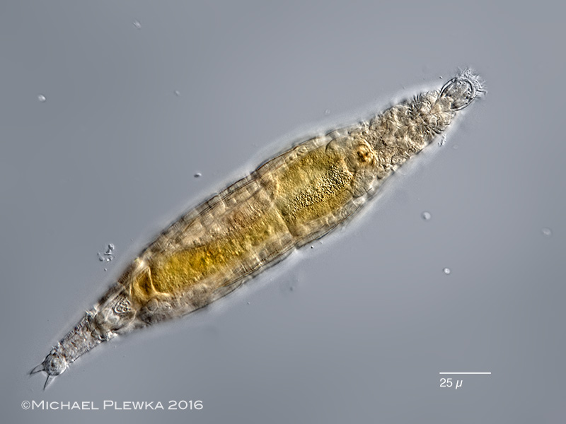 | Philodina sp.1; creeping specimen, dorsoventral view. Focal plane on the ventral side: rostrum and spurs. . |