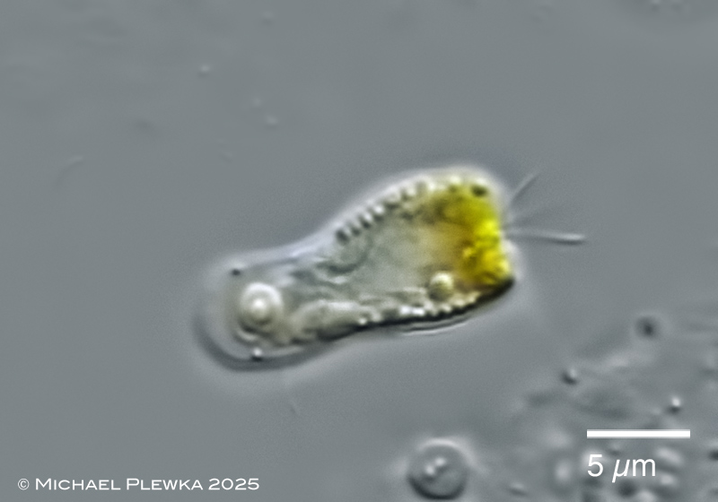 | Two specimens of the above mobile flagellated micro-alga. Left specimen: optical longitudinal transect with two long flagella (arrows) and one haptonema (arrowhead). The cell has two chloroplasts; preferably the posterior half of the cell is filled with granules at the inner side of the cell wall, which are also visible in the specimen on the right. |