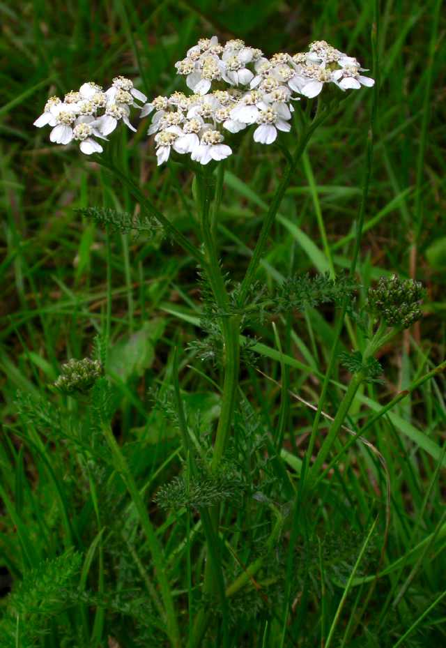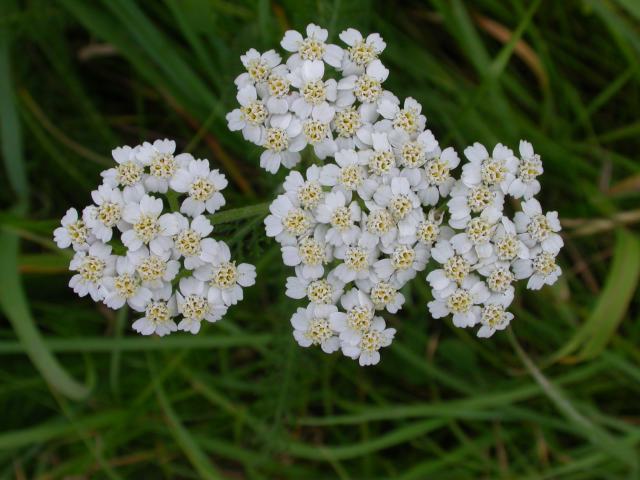 Wiesen-Schafgarbe (Achillea millefolium): bei näherer Betrachtung der Blüten stellt man fest, dass die Schafgarbe nicht, wie man zunächst vermuten könnte, ein Doldenblüter ist, sondern zur Famile der Korbblüter gehört |