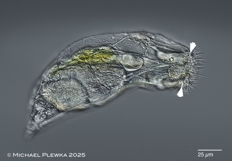 | Encentrum marinum; same specimen focus plane on a ring of motile cilia of the corona (arrowheads) (7) |