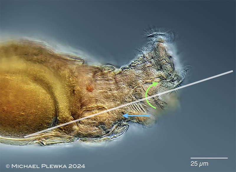 | Philodina alata; whirling; lateral view. Focal plane on the cilia of the buccal field/ buccal tube. There are two different pairs of ciliary fields generating different water currents. The arrows indicate the direction of the metachronal waves of these cilia, not the direction of the water flow. Although the direction of the metachronal waves indicated by the green arrow is to the dorsal side, the water flow is to the ventral side. Particles in this area are transported outwards. The blue arrow marks the pair of ciliary fields that create a current towards the mastax. The white line marks the plane of the optical transect no.2 in the upper image sequence. Similar behavior of the coronal cilia could be observed and documented for Philodina roseola. |